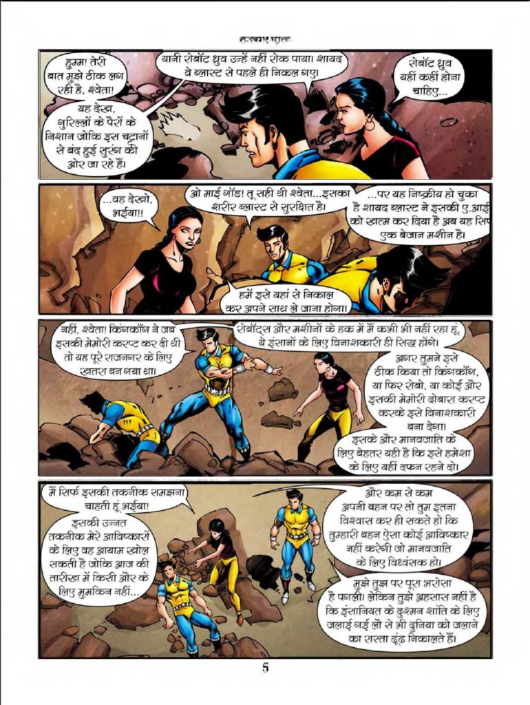 स्तुति मिश्रा ने इस अंक के ज़रिए साइंस-फिक्शन के उन पहलुओं को छुआ है, जो भारतीय कॉमिक्स में बहुत कम देखने को मिलते हैं। ‘प्रोटोप्लाज्मिक एनालिसिस’, ‘ब्रेन मैपिंग’ और ‘ए.आई. कॉन्फ्लिक्ट’ जैसे शब्द कहानी को आधुनिक और इंटरनेशनल फील देते हैं। संवादों में एक गहरी दार्शनिक सोच झलकती है—खासतौर पर ध्रुव का यह संवाद कि, “बहन की रक्षा का वचन ही वह जज़्बात था, जिसने रोबोट ध्रुव की ए.आई. को सक्रिय किया।” यह लाइन पूरी श्रृंखला की आत्मा को बयान कर देती है।