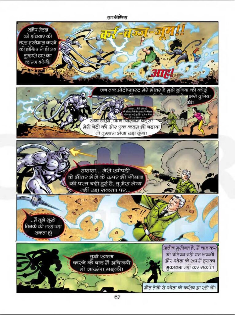 हेमंत कुमार और जगदीश कुमार की जोड़ी ने इस अंक में वाकई कमाल कर दिया है। कवर पेज पर ध्रुव का आधा मशीनी और आधा इंसानी चेहरा पूरी ‘राजनगर रक्षक’ श्रृंखला के सार को एक ही तस्वीर में बयां कर देता है। पन्ना संख्या 66 से 68 तक जॉन विलियम का एक विशाल मॉन्स्टर में बदलना और ध्रुव के साथ उसकी टक्कर के दृश्य बेहद विस्तृत, दमदार और रोमांच से भरपूर हैं।