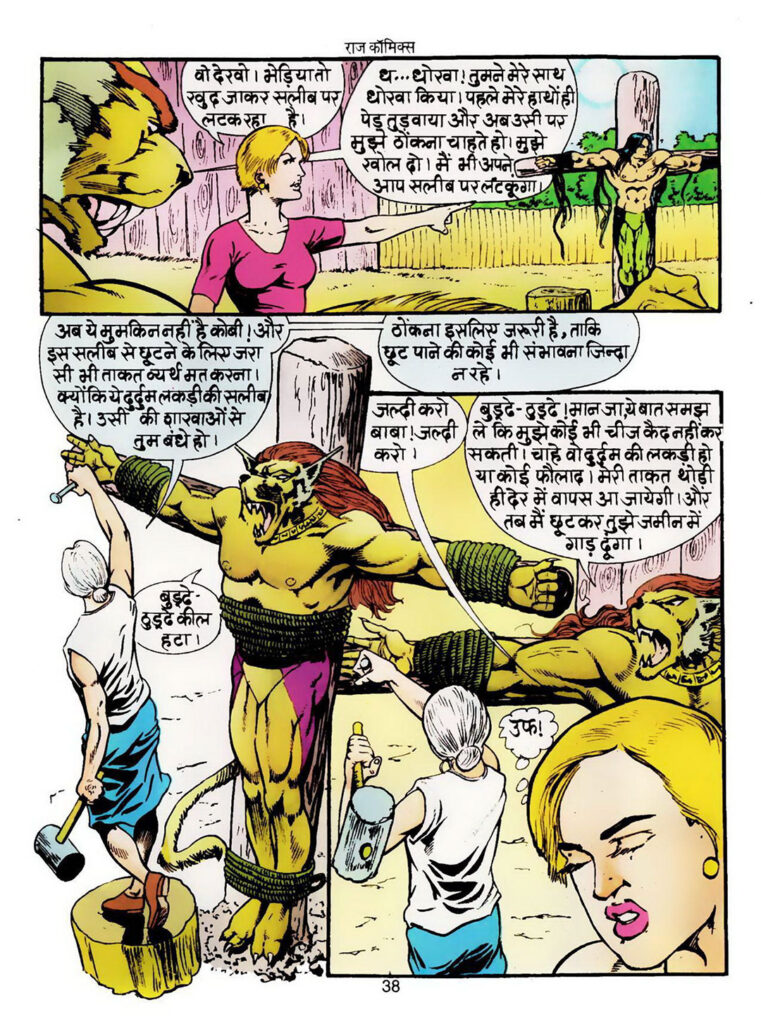 The climax of the comic starts from here. The crucified, nailed, bleeding wolf and Kobi, with their destructive power, attack those demons. This was not war, it was genocide. The ferocious way in which Dheeraj Verma has portrayed this fight is amazing. The fierce form of the wolf and Kobi is worth seeing.