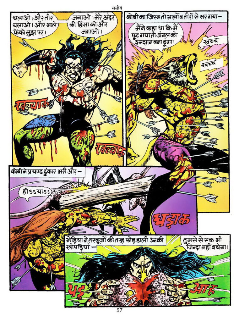 This entire sequence is the culmination of Dheeraj Verma’s portrayal. Action, speed and Kobi’s growing anger are clearly visible on every page. Tarun Wahi plays with the psychology of Kobi here. Kobi cannot understand why his own forest, of which he considers himself king, has turned against him. His ego makes him even more tired.