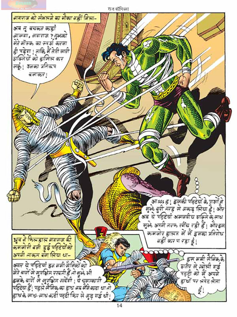 नागराज (Nagraj): नागराज हमेशा की तरह गंभीर और जिम्मेदार है। वह मिस्त्र की सरकार द्वारा भारत को दिए गए खजानों की रक्षा को अपना फर्ज मानता है। वह तूतेन खामेन के इरादों को गंभीरता से लेता है और अपनी नाग-शक्तियों का इस्तेमाल करता है। कहानी के शुरूआती दृश्य में ध्रुव और सौडांगी के साथ उसकी हल्की-फुल्की बातचीत उसकी सामाजिक सहजता दिखाती है।