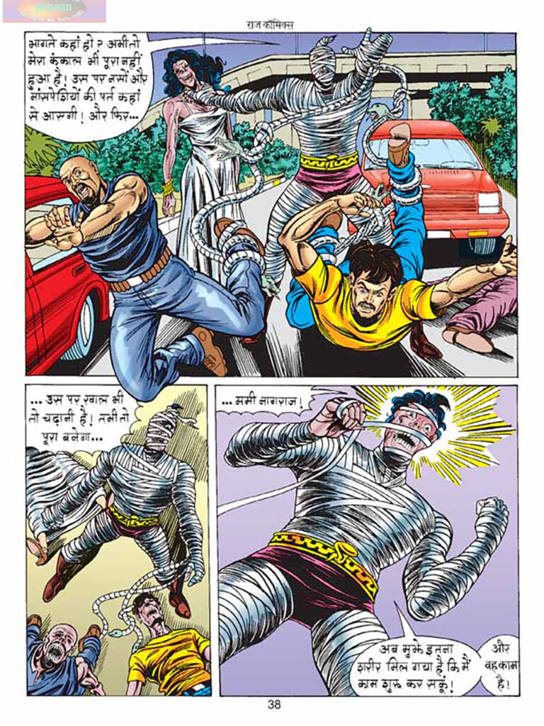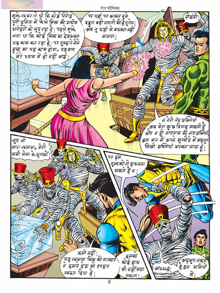 इस बड़े रहस्य के सामने आने के तुरंत बाद, कहानी में खलनायक ‘तूतेन खामेन’ की एंट्री होती है। तूतेन खामेन मिस्र की प्राचीन धरोहरों को लूटने वाले एक गिरोह का सरगना है, जिसे नागराज पहले सिर्फ एक देशभक्त समझते थे। तूतेन खामेन अपनी ‘ममी सेना’ (Mummy Army) के साथ प्रदर्शनी पर हमला करता है। ये ममी मृत सैनिकों के कंकाल हैं, जिनमें अद्भुत ताकत है।