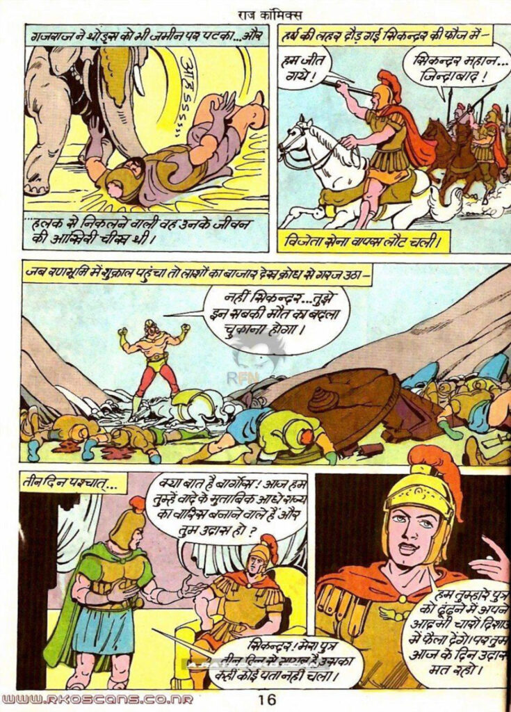 सिकंदर की विशाल सेना, युद्ध में हाथियों का तांडव और तलवारों की टकराहट—इन सबको बहुत भव्य और रोमांचक अंदाज में दिखाया गया है। हर पैनल में एक अलग तरह की ऊर्जा महसूस होती है और लड़ाई के सीन पढ़ते समय ऐसा लगता है जैसे सब कुछ आँखों के सामने चल रहा हो। एक्शन में गति (Motion) का अहसास साफ दिखाई देता है।