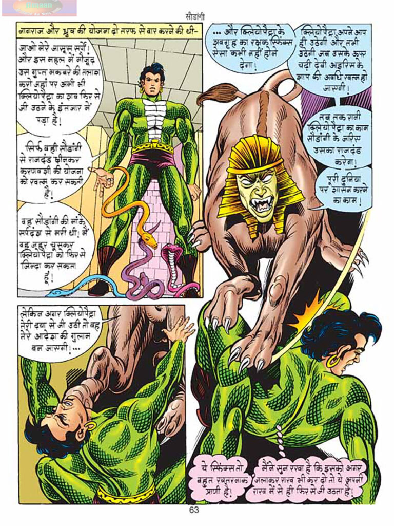 ध्रुव सीधा उस सर्प-प्राणी से भिड़ता है, जिसने राजनगर में हमला किया है। उसे पता चलता है कि उस सांप की त्वचा इतनी सड़ी-गली है, जैसे वह किसी एसिड के ड्रम से बाहर आया हो। यह उसकी खतरनाक प्रकृति और तूतेन खामेन की काली शक्ति को दर्शाता है।