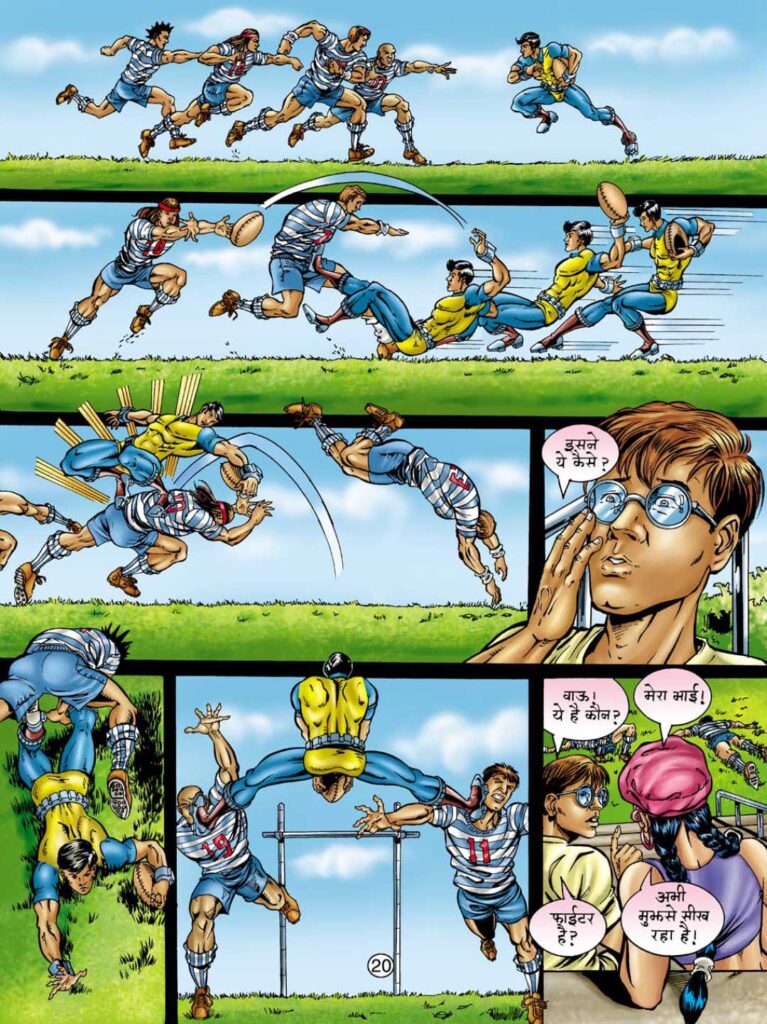 In this comic, Dhruv is seen less in his traditional dress and more in a normal civilian look. That is what makes this story a little different, because here we see him not just as a superhero, but also as a responsible brother. His wisdom and always-alert nature are clearly visible. He is concerned about his sister’s safety, and this concern further strengthens his human side. During a rugby match, his fitness and agility prove that he is different and excellent even without any superpower. He is strong in both mind and body, and that is what makes him special.