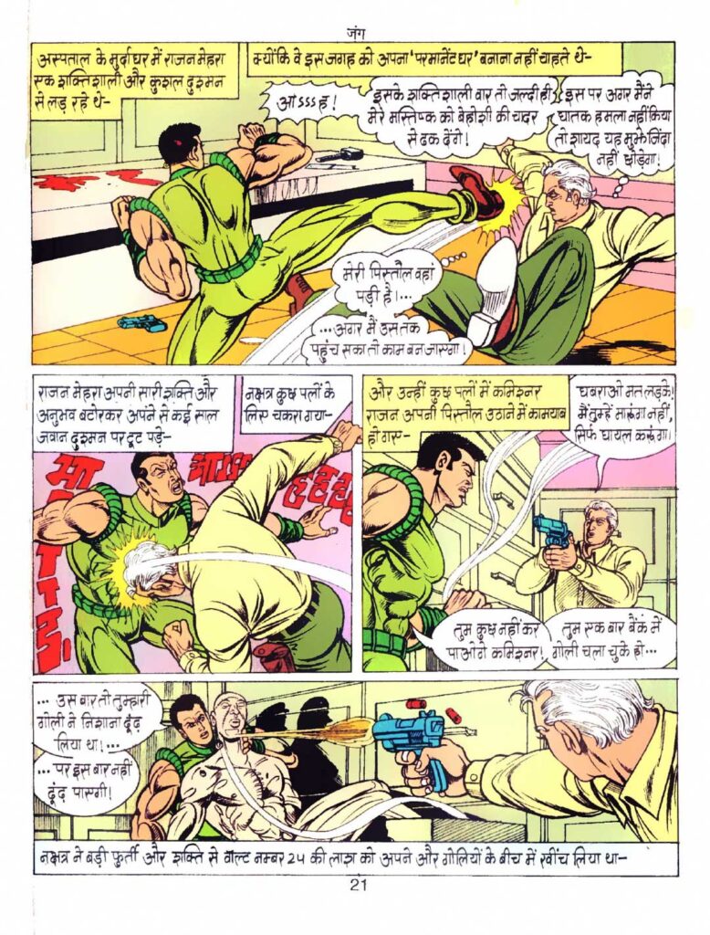 अनुपम सिन्हा भारतीय कॉमिक्स की दुनिया के सच्चे ‘लेजेंड’ माने जाते हैं और ‘जंग’ में उनका काम सच में अपने पूरे शबाब पर नजर आता है। किरदारों के शरीर की हर हरकत, खासकर एक्शन सीन में दिखाई देने वाला लचीलापन, इतना असली लगता है कि जैसे पैनल के बाहर निकल आएगा। हर पैनल कहानी को आगे बढ़ाता है, कहीं भी ठहराव महसूस नहीं होता। रंगों का चुनाव भी कमाल का है—रात के दृश्य, रहस्य और गंभीर माहौल को रंग बहुत अच्छे से उभारते हैं। अस्पताल के गलियारे हों, बारिश में भीगे सीन हों या निर्माणाधीन इमारत की ऊबड़-खाबड़ संरचना, हर जगह बारीकी और मेहनत साफ नजर आती है।