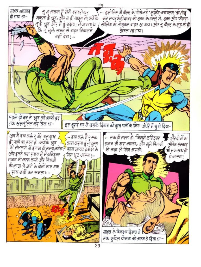 ‘जंग’ की कहानी एक बेहद संवेदनशील और चौंकाने वाले मोड़ से शुरू होती है। इस कहानी का मुख्य खलनायक है ‘नक्षत्र’। नक्षत्र का किरदार कई मायनों में ध्रुव से काफी मिलता-जुलता है—वह भी सर्कस की कलाओं में माहिर है, बेहद फुर्तीला है और शारीरिक रूप से काफी मजबूत है। कहानी की पृष्ठभूमि में ‘जुपिटर सर्कस’ की तबाही और ध्रुव के अतीत से जुड़ी कुछ पुरानी घटनाएं भी जुड़ी हुई हैं, जो कहानी को और गहराई देती हैं।