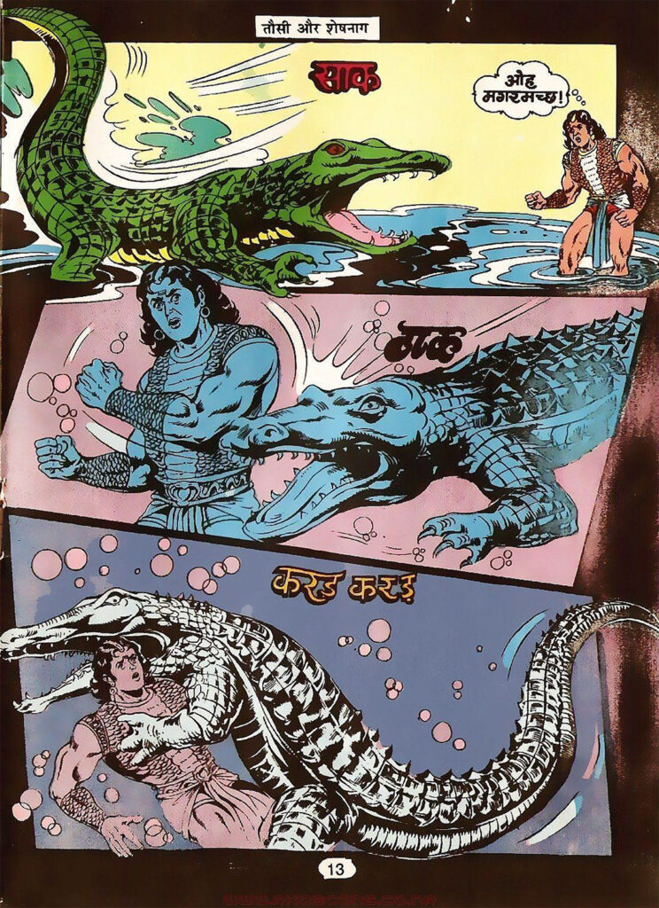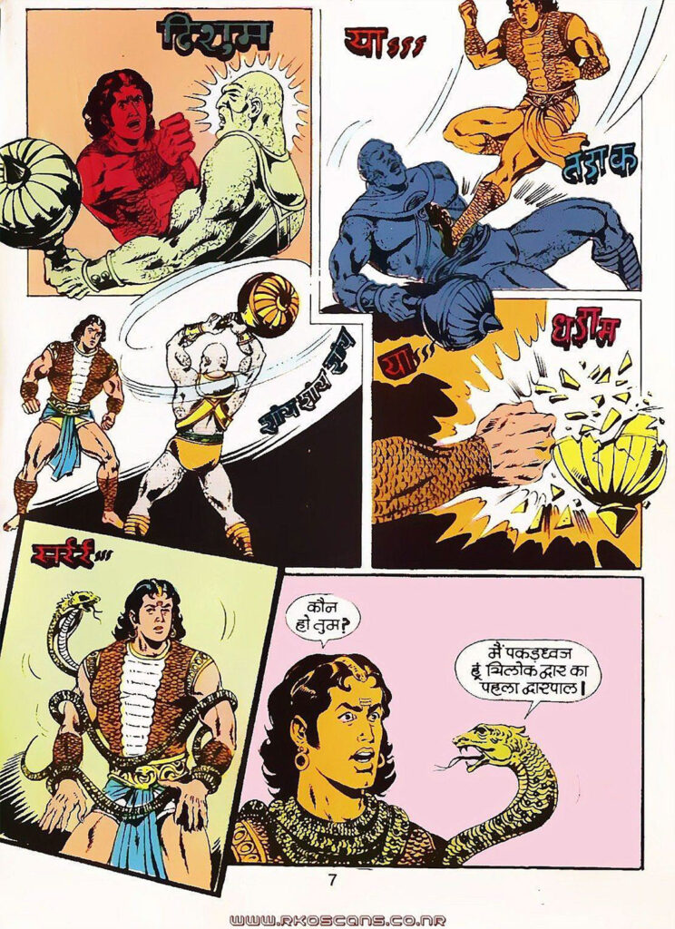 ‘Speed lines’ and sound indicator words (such as — spat, dhad, fass) have been used extensively to show speed in fight scenes. The design of monsters and defenders (such as ‘Octodhwaj’) is quite interesting. Whereas the depiction of Sheshnag is extremely gorgeous—behind him the divine light (Aura) is shown which makes the scene even more spectacular.