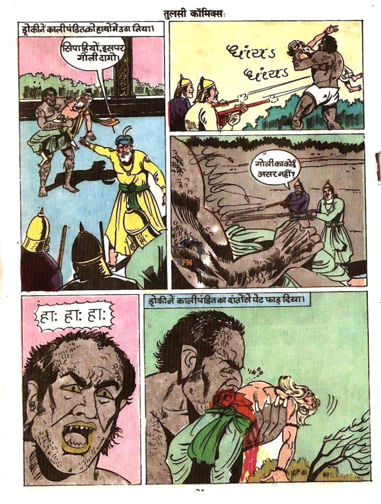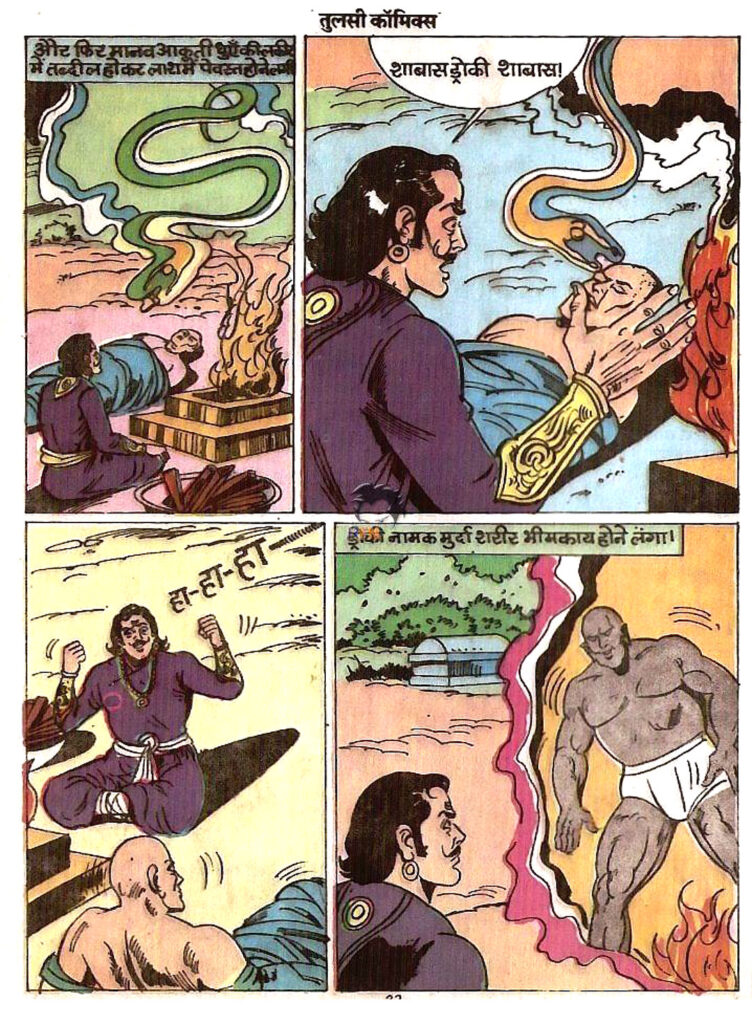 मिसेज रंजीता का चित्रांकन और बी.के. स्टूडियो की कला इस कॉमिक्स को सचमुच जीवंत बना देती है। उस दौर की छपाई की सीमाओं के बावजूद रंगों का बहुत ही प्रभावशाली इस्तेमाल किया गया है। खासतौर पर श्मशान के दृश्यों में गहरे बैंगनी और काले रंग एक रहस्यमयी और डरावना माहौल रचते हैं। पात्रों के भावों को दिखाने में भी कलाकारों ने शानदार काम किया है। होगह का गुस्सा हो या काली पंडित की मृत्यु के समय का दर्द, हर भाव पाठक को अंदर तक छूता है। वहीं द्रोकी का विशाल शरीर और उसके नुकीले, खूंखार दांत डर पैदा करने के लिए काफी हैं। एक्शन दृश्यों में भी जबरदस्त ऊर्जा दिखती है, खासकर वह पैनल जहाँ तौसी सांप के रूप में द्रोकी पर हमला करता है, जो रोमांच को चरम पर पहुंचा देता है।
