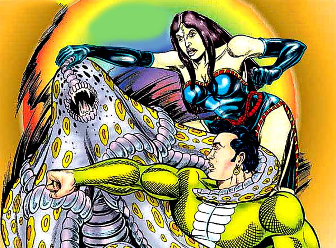 In the famous story of Raj Comics ‘Vish-Amrit’, Vish and Amrit are two alien characters known for their contrasting powers and mysterious ‘cosmic game’. Vish appears in a female form as a destroyer, whose aim is to make the entire planet barren by destroying life, while Amrit appears in a male form as a life-giver, who tries to stop Vish’s destruction.