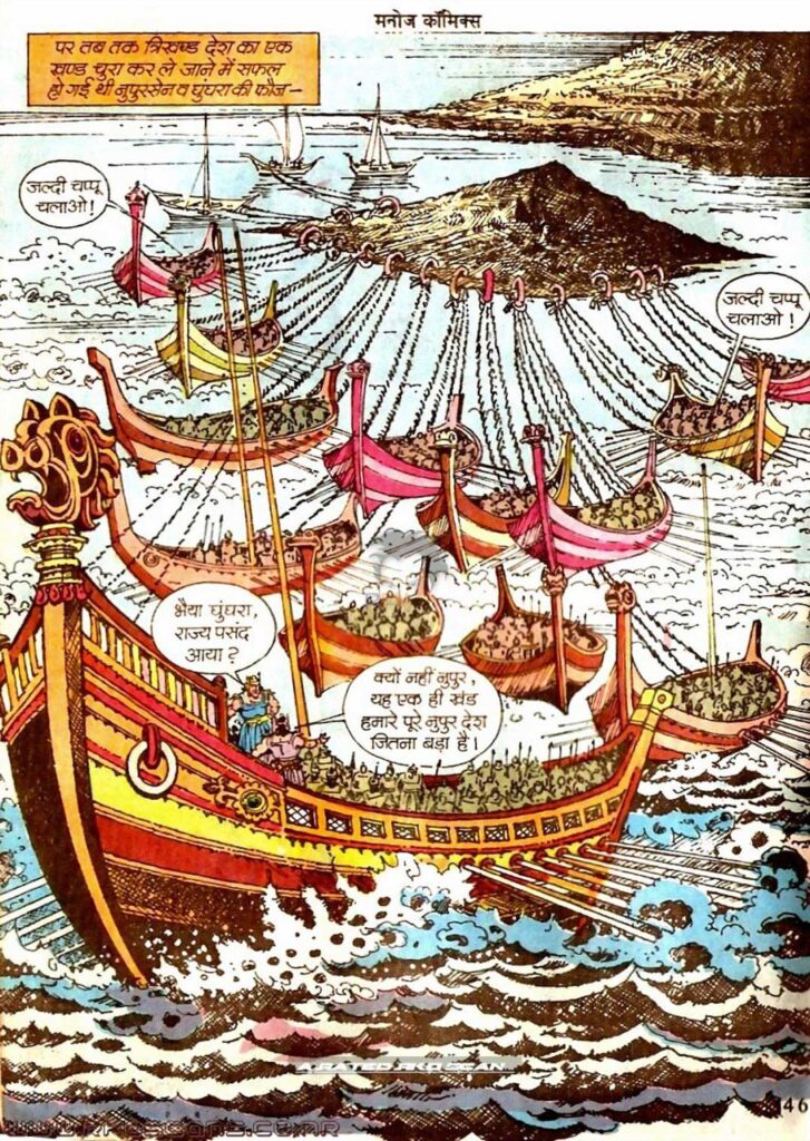 यहीं से कहानी का मुख्य विलेन ‘पोखर’ पूरी तरह सामने आता है। पोखर एक लालची और चालाक वैज्ञानिक है, जिसकी नज़र पत्थर ग्रह की सबसे बड़ी ऊर्जा शक्ति ‘रक्तमणि’ पर टिकी होती है। अपने स्वार्थ के लिए वह दो पड़ोसी ग्रहों—पत्थर ग्रह और टमटम ग्रह—के बीच भयंकर युद्ध भड़का देता है। वह सम्राट स्टोनो के दूत की हत्या कर देता है और सारा दोष टमटम ग्रह के सम्राट शुशाण्डा पर डाल देता है। राजनीति, धोखा और अंतरग्रहीय युद्ध के ये दृश्य इस कॉमिक्स को एक ज़बरदस्त ‘स्पेस ओपेरा’ जैसा एहसास देते हैं।