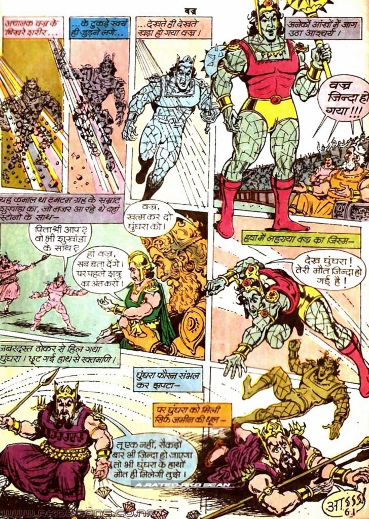 ‘A.M.R.’ द्वारा किया गया चित्रांकन ‘वज्र’ की इस कड़ी को अपने समय की ज़्यादातर कॉमिक्स से कहीं आगे ले जाता है। पत्थर ग्रह और टमटम ग्रह के दृश्य बेहद कल्पनाशील लगते हैं। खासकर अंतरिक्ष यानों और वैज्ञानिक मशीनों के अनोखे डिज़ाइन पाठक को एक बिल्कुल नई दुनिया में पहुँचा देते हैं। वज्र के टूटकर फिर से लड़ने की शैली और उसकी गदा के वार में दिखाई गई गति (Motion) एक्शन दृश्यों को जीवंत बना देती है। इसके साथ ही रंगों का शानदार इस्तेमाल—खासतौर पर रक्तमणि की दिव्य चमक और वज्र के सुनहरे अंगों की आभा—पूरी कॉमिक्स को एक प्रीमियम और भव्य विजुअल अनुभव देता है।