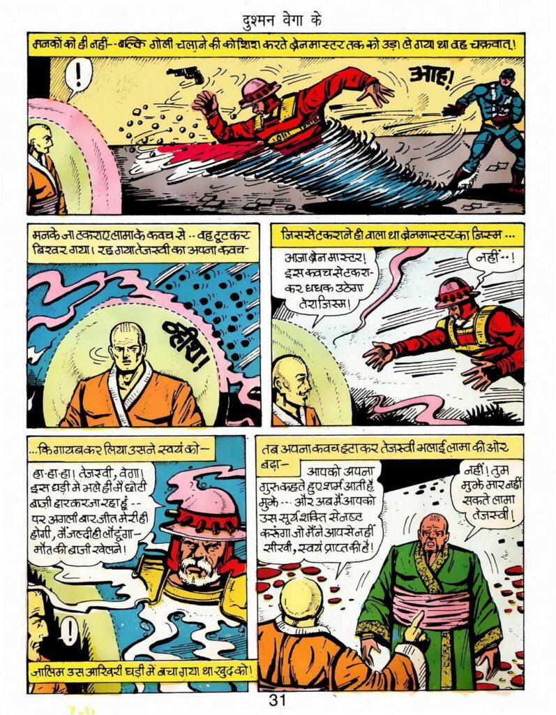 जैसे ही शूटर लामा पर गोली चलाने के लिए ट्रिगर दबाता है, उसी वक्त कहानी में हमारे हीरो ‘वेगा’ की एंट्री होती है। वेगा अपनी तेजी और ताकत से शूटर की बंदूक की नली मोड़ देता है, जिससे गोली अपने निशाने से चूक जाती है और लामा तेजस्वी की जान बच जाती है। लेकिन यहीं से कहानी में एक दिलचस्प मोड़ आता है, जिसे गलतफहमी की शुरुआत कहा जा सकता है। लामा तेजस्वी, जो अपनी योग साधना में डूबे हुए थे, वेगा को ही हमलावर समझ लेते हैं। पुलिस और सुरक्षा बल भी कन्फ्यूज हो जाते हैं। लामा तेजस्वी अपनी मानसिक शक्ति और योग बल का इस्तेमाल करके वेगा को एक ऊर्जा के पिंजरे में कैद कर लेते हैं। यह सुपरहीरो कॉमिक्स का एक जाना-पहचाना पल है, जहाँ दो अच्छे किरदार आपस में टकरा जाते हैं, और यहीं से वेगा की असली परीक्षा शुरू होती है। उसे अपनी बेगुनाही साबित करनी है और साथ ही उन असली दुश्मनों को भी ढूंढना है जो छिपकर हमला कर रहे हैं।