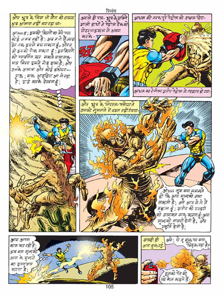 नायकों का चित्रण भी शानदार है — उनके क्लासिक लुक्स को बरकरार रखते हुए, उनके एक्शन सीन्स में जो ऊर्जा और मूवमेंट दिखाई देती है, वह सिन्हा की खासियत है। ‘विध्वंस’ के फाइट सीन सिर्फ मुक्के-लातों तक सीमित नहीं हैं; वे कॉस्मिक लेवल पर पहुँच जाते हैं। सधम और अधम की ताकतों की भिड़ंत, नागराज के सर्पों का जाल, परमाणु के विस्फोट और ध्रुव के स्टंट — हर पैनल में धमाका है।