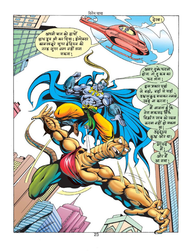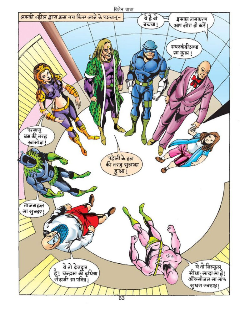 ‘विलेन चाचा’ (संख्या 636) सिर्फ़ एक कॉमिक्स नहीं, बल्कि एक ऐसा बड़ा इवेंट है जिसमें सुपर इंडियन, शक्ति, तिरंगा और डोगा जैसे बड़े सुपरहीरोज़ एक साथ नज़र आते हैं। ये कॉमिक्स ज़्यादातर ‘देश के बेटे’ सुपर इंडियन के तीसरे रोमांचक सफर पर फोकस करती है और धीरे-धीरे उसकी असली कहानी यानी उसकी origin story को खोलती चलती है। तरुणकुमार वाही की लिखी और दिलीप चौबे की बनाई ये कॉमिक्स अपनी बड़ी सोच, दिलचस्प कहानी और जटिल प्लॉट की वजह से गहराई से पढ़ने लायक बन जाती है।
