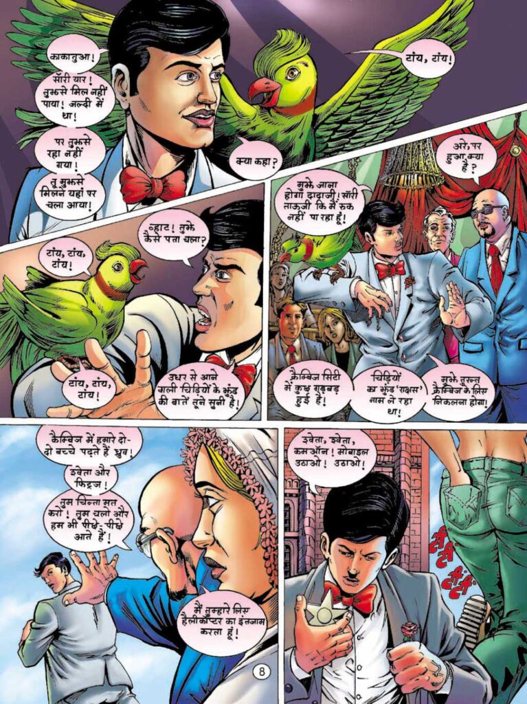 Anupam Sinha’s art is no less than a visual treat for the fans of Raj Comics. The extra legs that come out of Spider’s body, his creepy red eyes, and the changes that come to his face are shown very closely. At the same time, Spider’s swing between the buildings and Dhruv’s action scenes feel tremendously dynamic. The artist has been completely successful in making the backdrop of England’s streets, churches, and labs stand out from the Indian environment. Especially in night scenes, the use of blue-violet colors and green to show radiation further increases the thrill of the story.