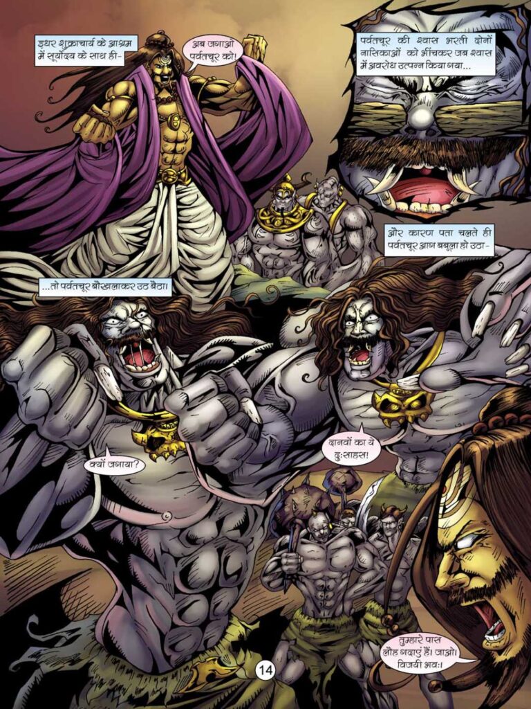 कहानी की शुरुआत दैत्यगुरु शुक्राचार्य के आश्रम से होती है। यहाँ शुक्राचार्य अपने शिष्यों, यानी दिति के पुत्रों—भूकम्पका, नरकटा, ब्रह्ममुष्ठि आदि—की परीक्षा लेते हैं। अब तक युद्धों में पत्थर और लकड़ी से बने हथियारों का इस्तेमाल होता आया था, लेकिन शुक्राचार्य उन्हें पहली बार लौह (Iron) से परिचित कराते हैं। वे ज्वालामुखी की अग्नि से लोहे को पिघलाकर उससे घातक शस्त्र बनाना सिखाते हैं। यह दृश्य कहानी में एक बड़ी तकनीकी क्रांति को दर्शाता है। शुक्राचार्य का यह कहना— “यह धातु तुम्हारी विजय का प्रतीक बनेगी”—आने वाले भयानक युद्धों का साफ संकेत देता है।