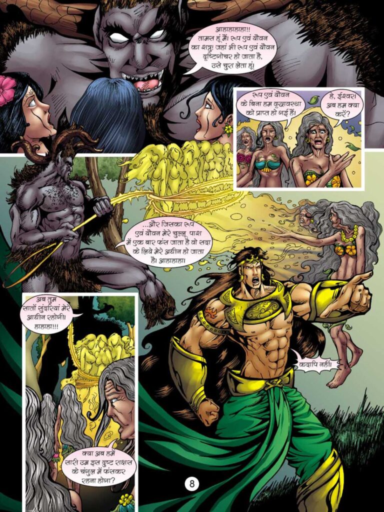 सृष्टि के विस्तार के लिए प्रजापति के आदेश पर दिव्य अप्सराओं—मेनका, उर्वशी, रंभा आदि—का जन्म होता है। लेकिन उनकी सुंदरता को देखकर तामस नाम का एक क्रूर राक्षस उन पर हमला कर देता है। तामस की शक्ति है रूप और यौवन को चुरा लेना। वह अप्सराओं की सुंदरता छीनकर उन्हें वृद्ध बना देता है। यह हिस्सा कहानी में सुंदरता और अंधकार के टकराव को बेहद प्रभावी ढंग से दिखाता है।