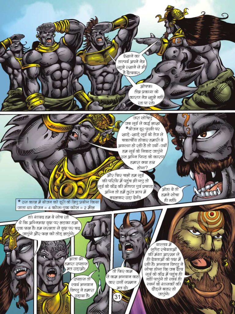 In the comics, the secret of the birth of a ‘sunflower’ flower has been told through the story of a Yaksha and a Yakshini. A Yaksha who was engaged in the rigorous meditation of the Sun had to turn into ashes due to the curse of the Yakshini, and from those ashes, a sun-faced flower was born. This flower can withstand the speed of the sun. The first stage of the competition is to find this flower and control the ‘Agnabhiksha’ (a creature that swallows the sun) living at the center of the sun. This is a great example of the author’s imagination.