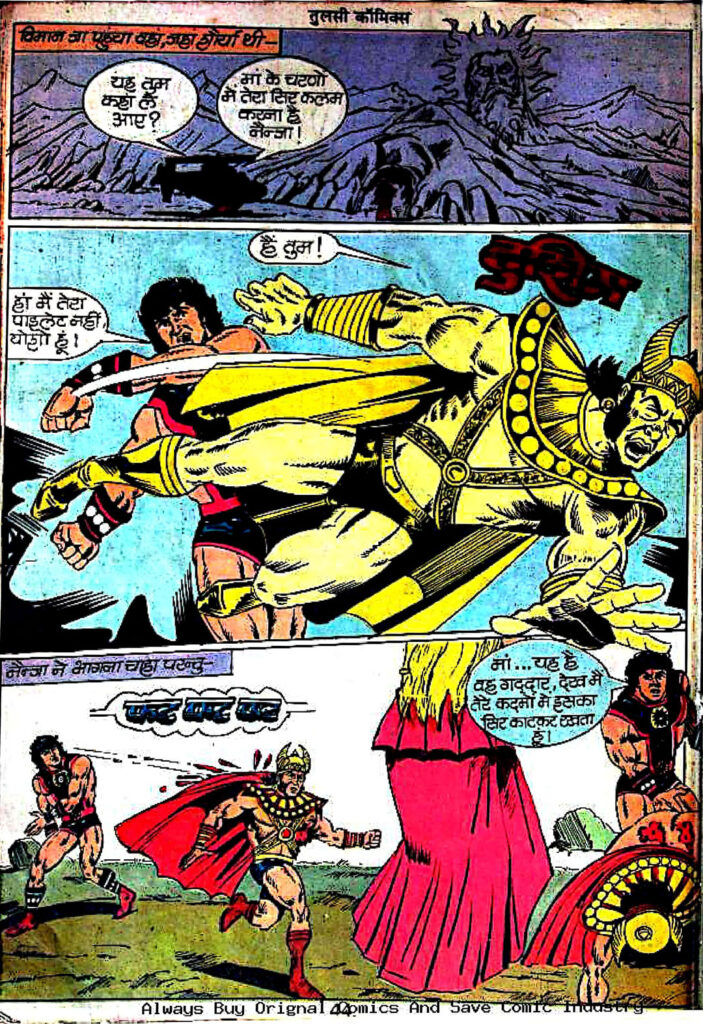 जब नैन्जा को समझ आता है कि जनता और सेना दोनों अब उसके खिलाफ हो चुके हैं, तो वह डरकर भागने की कोशिश करता है। योशो और नैन्जा के बीच होने वाला हवाई युद्ध (Aerial Battle) इस कॉमिक्स का चरम बिंदु है। योशो हवा में उड़ते हुए विमानों को अपनी अग्नि शक्ति से तबाह कर देता है।